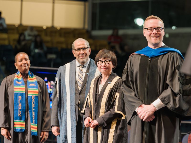 Installing TMU's 6th chancellor, Donette Chin-Loy Chang, with Chancellor Emerita Janice Fukakusa and Tony Staffieri, Chair of TMU's Board of Governors