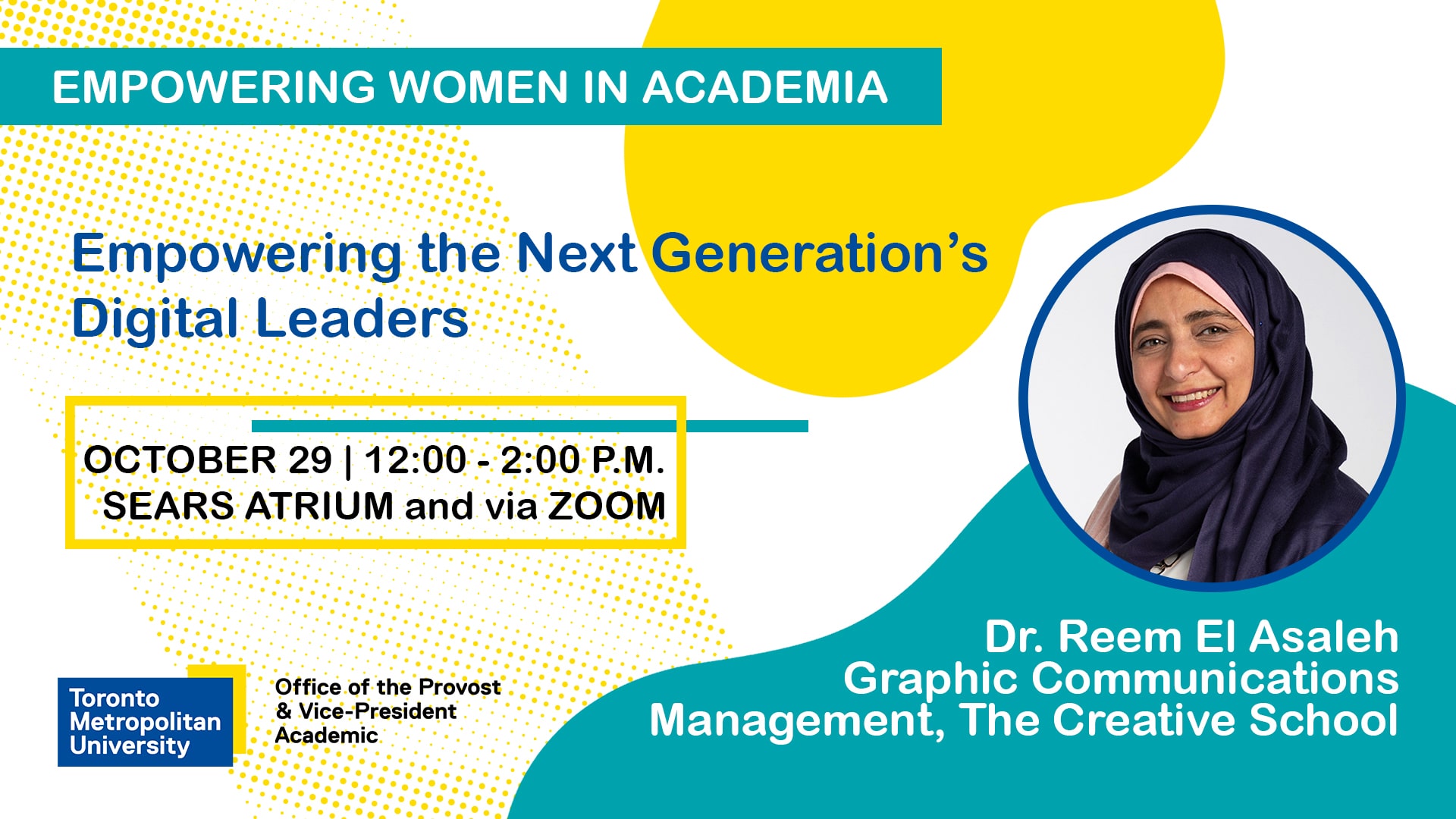 Join us for an inspiring lunch as part of the Empowering Women in Academia at TMU speaker series. This session will feature Dr. Reem El Asaleh (she/her), Associate Professor of Graphic Communications Management at The Creative School, as she delves into the transformative impact of teaching Digital Asset Management (DAM) at the undergraduate level and its benefits to students.