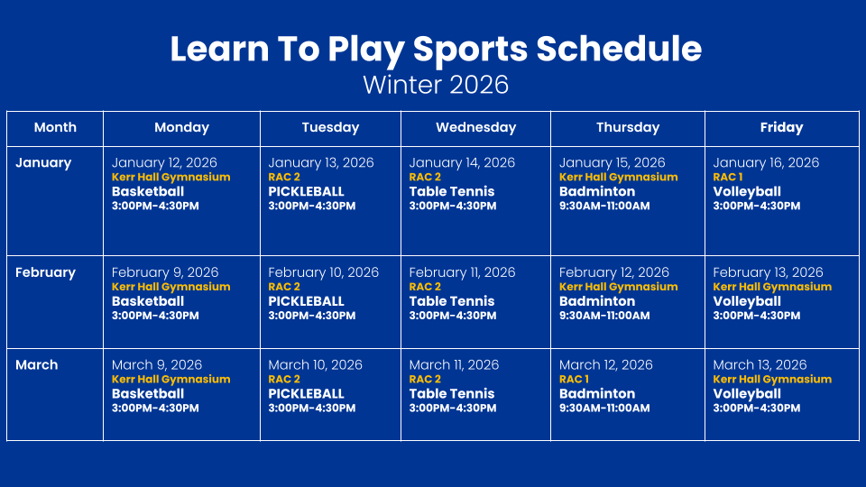 | Facilitated Drop-In | 1:00 PM -5:00 PM | RAC 1 Gym |