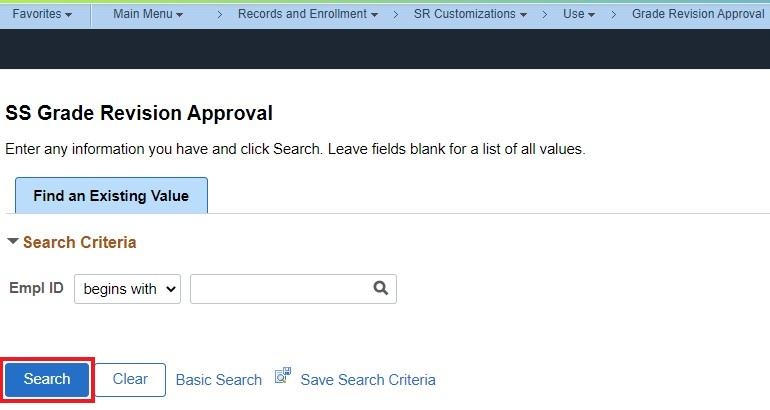 Click Search to display all pending Grade Revision Requests from your teaching department awaiting approval, then select the first request you want to review.