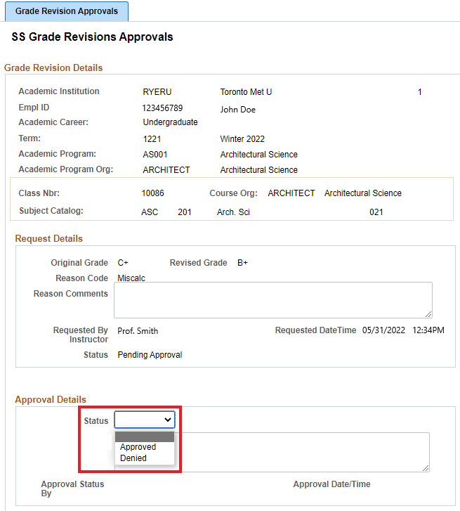 Review the information on the Grade Revision Request carefully. When you are ready to make a decision on approval of the request, select either Approved or Denied from the Status drop down menu.