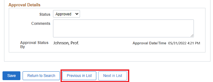 If you have more than one pending Grade Revision Request awaiting your approval, use the Next in List and Previous in List buttons to navigate through the remaining requests for review and approval.