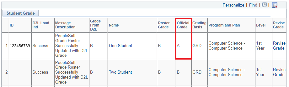 The ‘Roster Grade’ column will always display the grade that was originally submitted on the grade roster for the student. The ‘Official Grade’ is the final grade currently on the student record, including any approved grade revisions. If the ‘Roster Grade’ and ‘Official Grade’ are different, this is an indication that a grade revision has been submitted, approved, and processed.