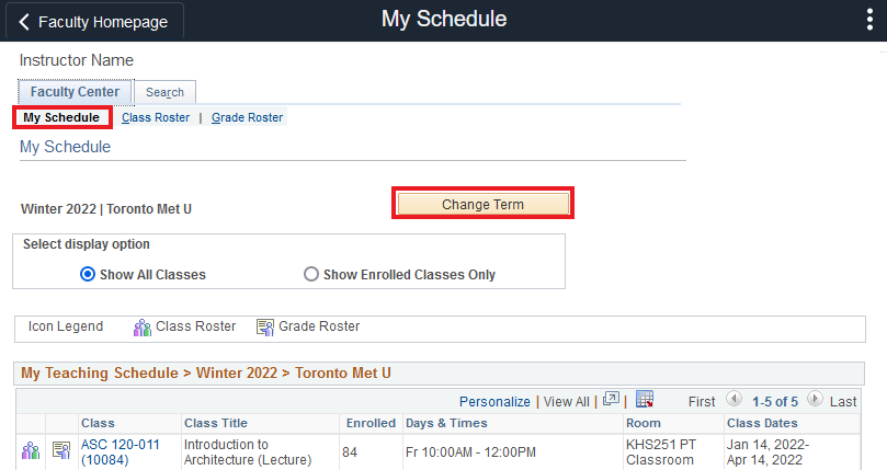 Select My Schedule. Ensure the appropriate term is selected. Use the Change Term button if you need to select a different term.