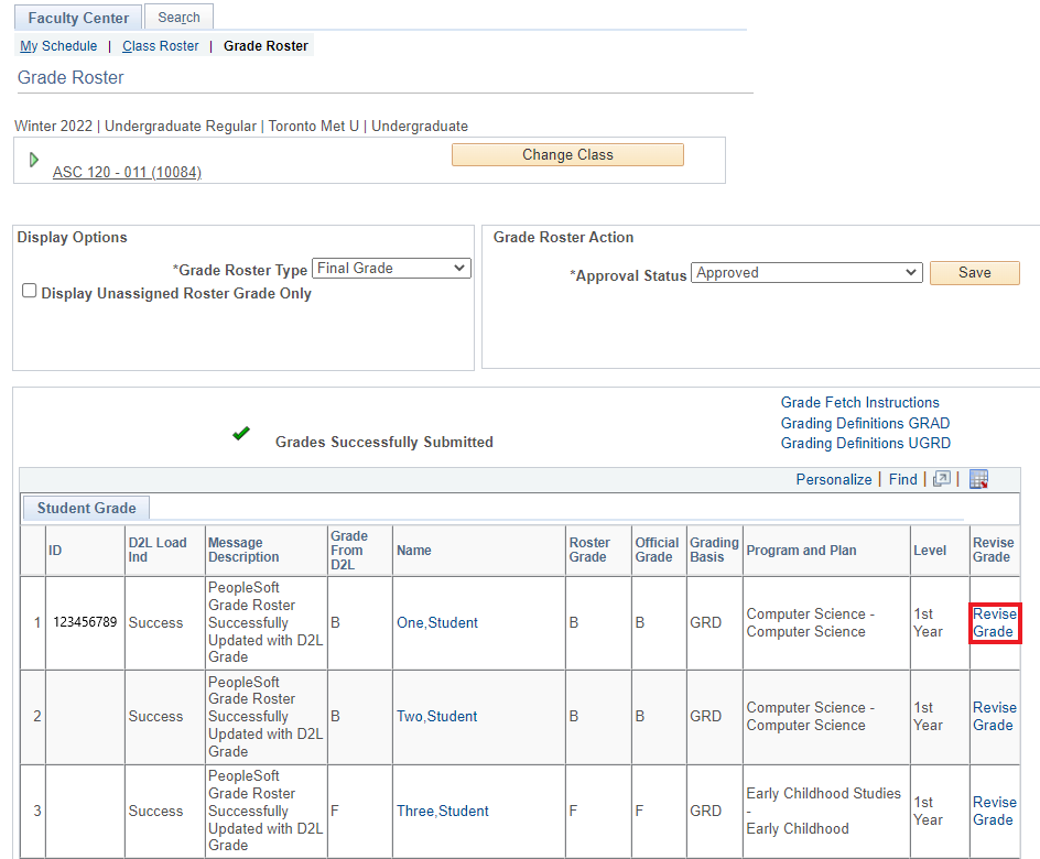 Select the Revise Grade link for the student whose grade you wish to revise. To view a different grade roster, you can use the Change Class button.