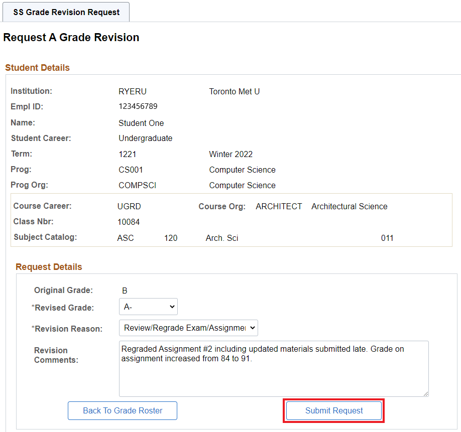 If you encounter any technical problems submitting or approving a Grade Revision Request using the Automated Grade Revision Process, please contact studentrecords@torontomu.ca.