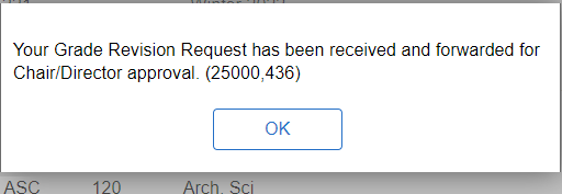 Once submitted, a message confirming that your Grade Revision Request has been received and forwarded for Chair/Director approval will display.