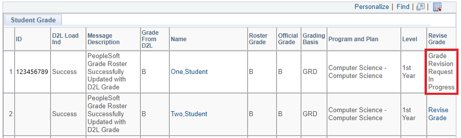 While awaiting Chair/Director approval, you will not be able to enter any additional grade revisions for the same student. The Revise Grade status for any student with a Grade Revision Request awaiting approval will indicate: ‘Grade Revision Request in Progress’.