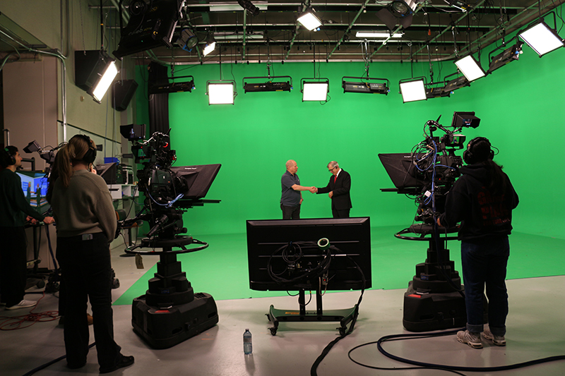 Down on the Arthur Smith Virtual Production Studio floor, Media Production and Sport Media students operated cameras and floor directed PBS host Marty Wimmer and guests from TMU throughout the broadcast.