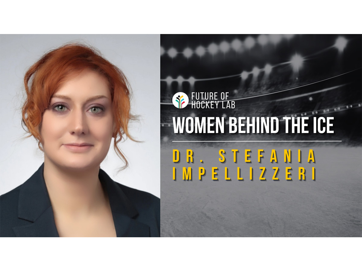 Dr. Stefania Impellizzeri kneeling and looking out onto an ice rink