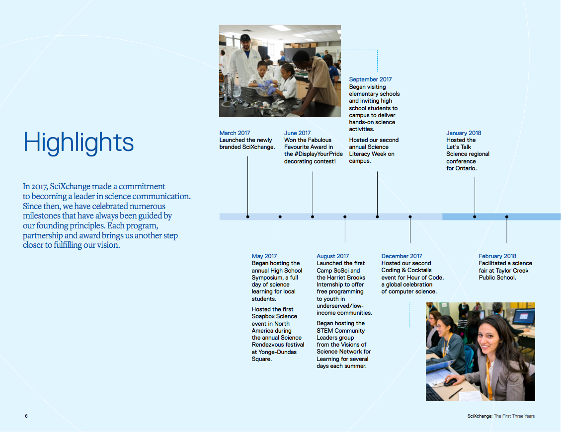 Community outreach has been a fundamental pillar of the Faculty of Science since its inception in 2011 and has guided initiatives aimed at increasing science literacy and diversity in STEM. It started with the Office of Science Outreach and Enrichment (OSOE), and would later transform into SciXchange in March of 2017. In 2017, SciXchange developed its mission, principles, and vision, that would serve as a guide through the creation of events and activities over the next 3 years.