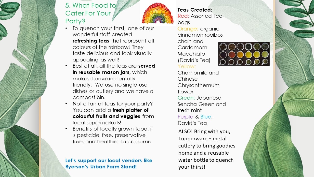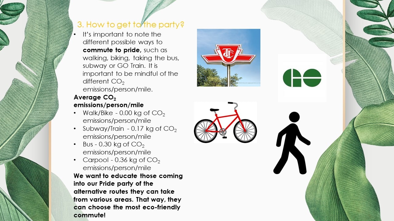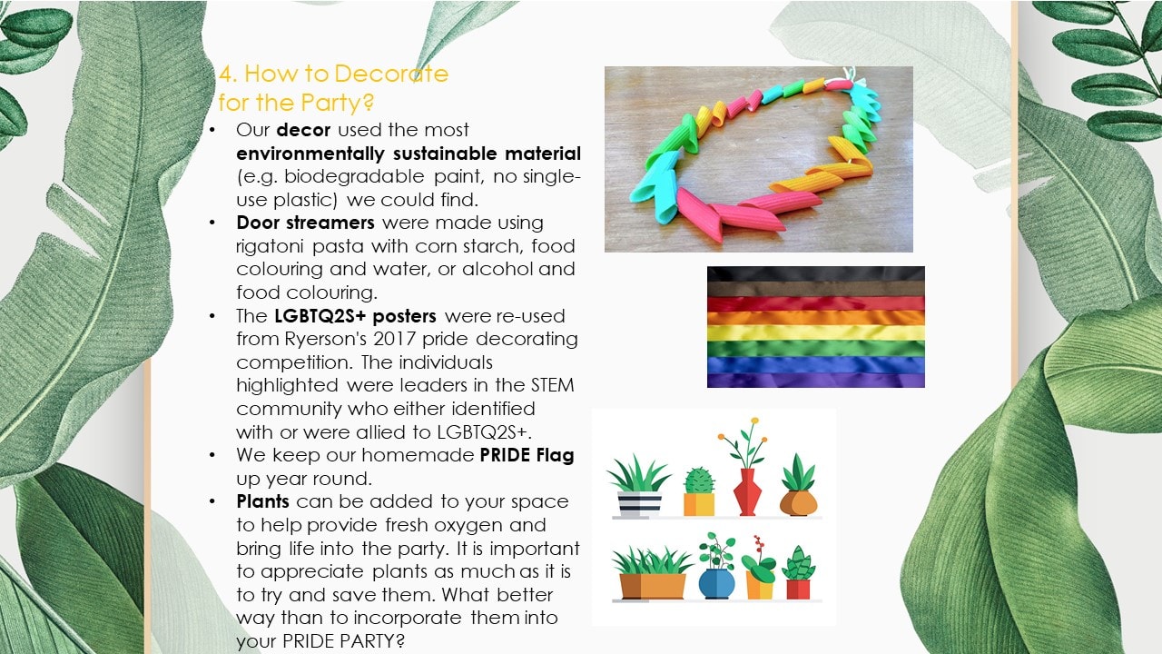 2. We centralized our theme around how everyone can make their own Pride celebrations as green as possible. This included displays showing the cleanest commute to downtown Toronto for the Pride Parade, visiting thrift stores to purchase clothing items for celebratory outfits instead of buying brand new, and using decor alternatives such as pasta noodles for DIY streamers.