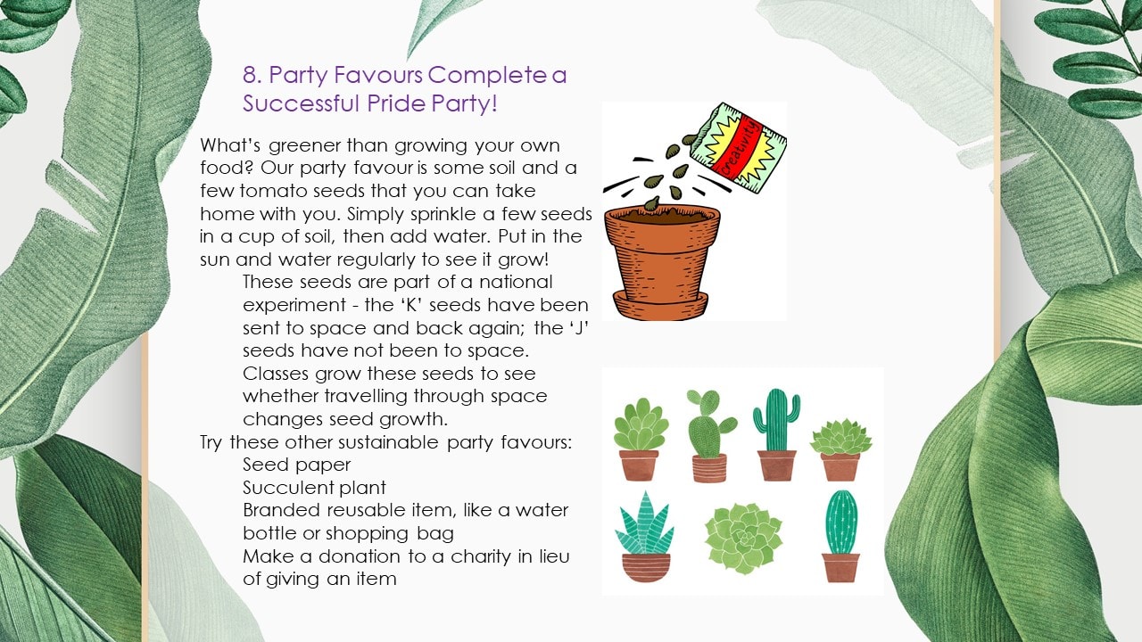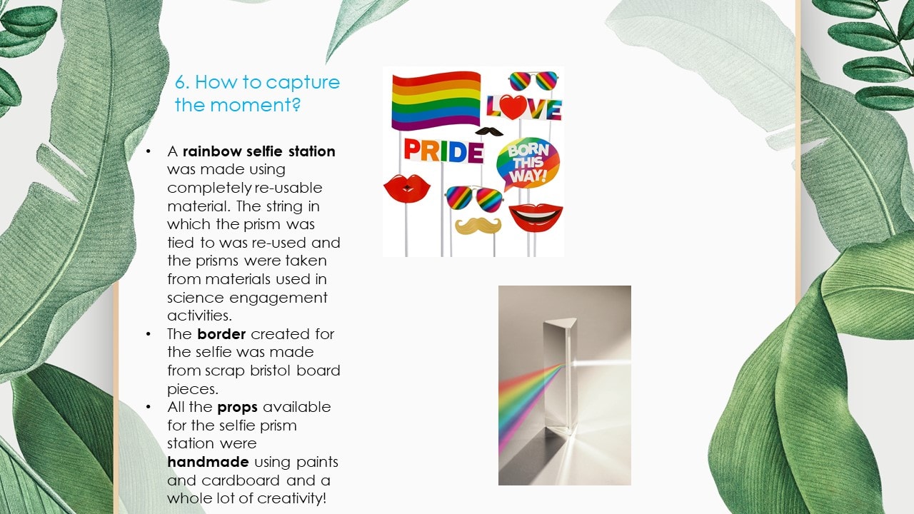 1. We used only sustainable materials. This included anything that is recyclable or compostable, as well as brought in items from home to repurpose them as part of our display. We did this to show that any part of a Pride celebration can be made envrionmentally friendly when you focus on using sustainable alternatives instead of traditional decorations.