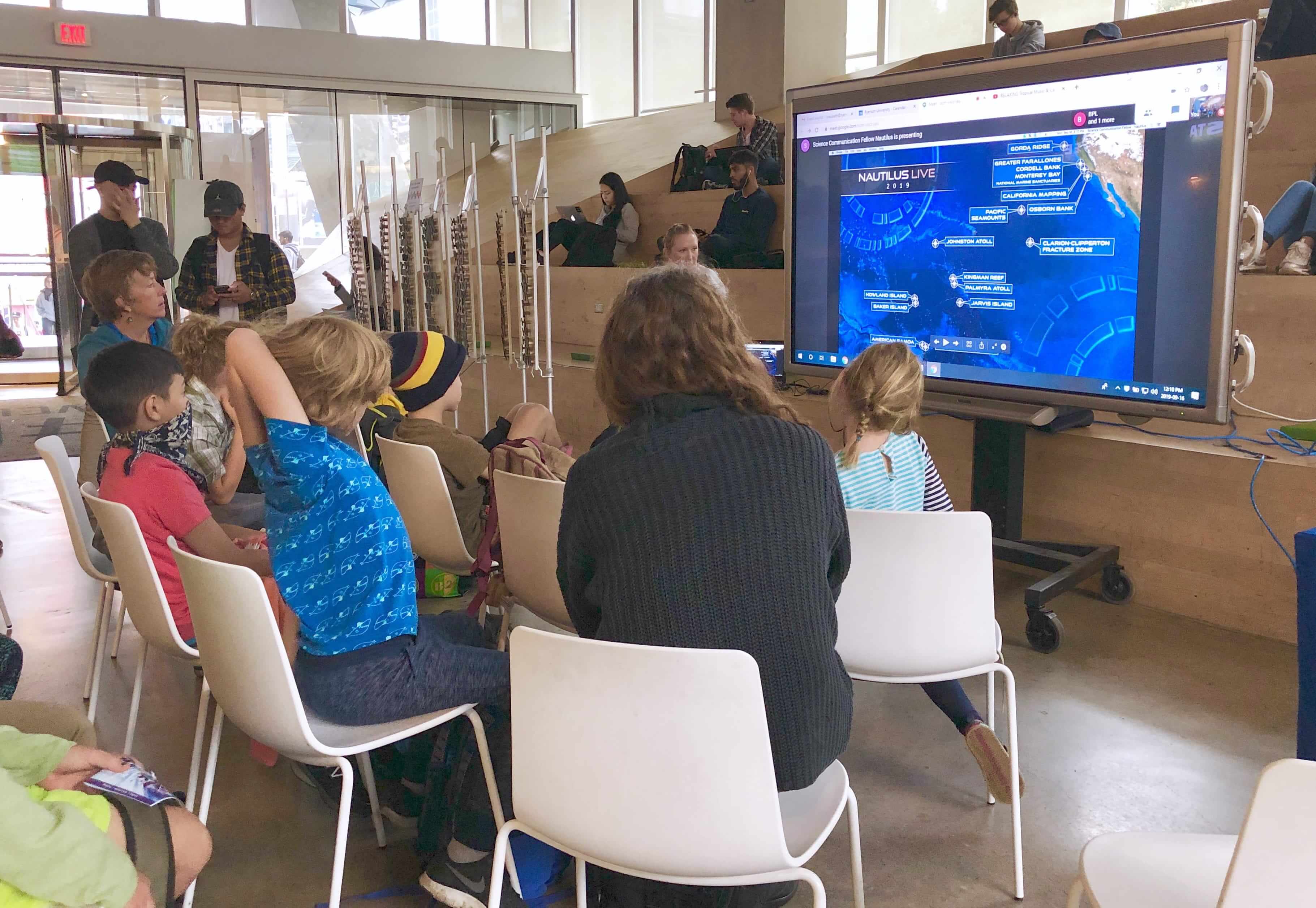 Celebrating the ocean research theme, SciXchange presented a livestream video chat in the Sheldon and Tracy Levy Student Learning Centre (SLC) on campus, with the Nautilus Expedition (external link, opens in new window) research vessel. Launching the 5th year of exploration in the Eastern Pacific Ocean, the Nautilus Expedition surveyed previously unexplored regions along the west coast of the United States, and the central Pacific. Science Literacy Week guests dropped by the SLC for a one hour live stream to learn about the ship and research directly from the Nautilus team who were on board and heading to Hawaii!