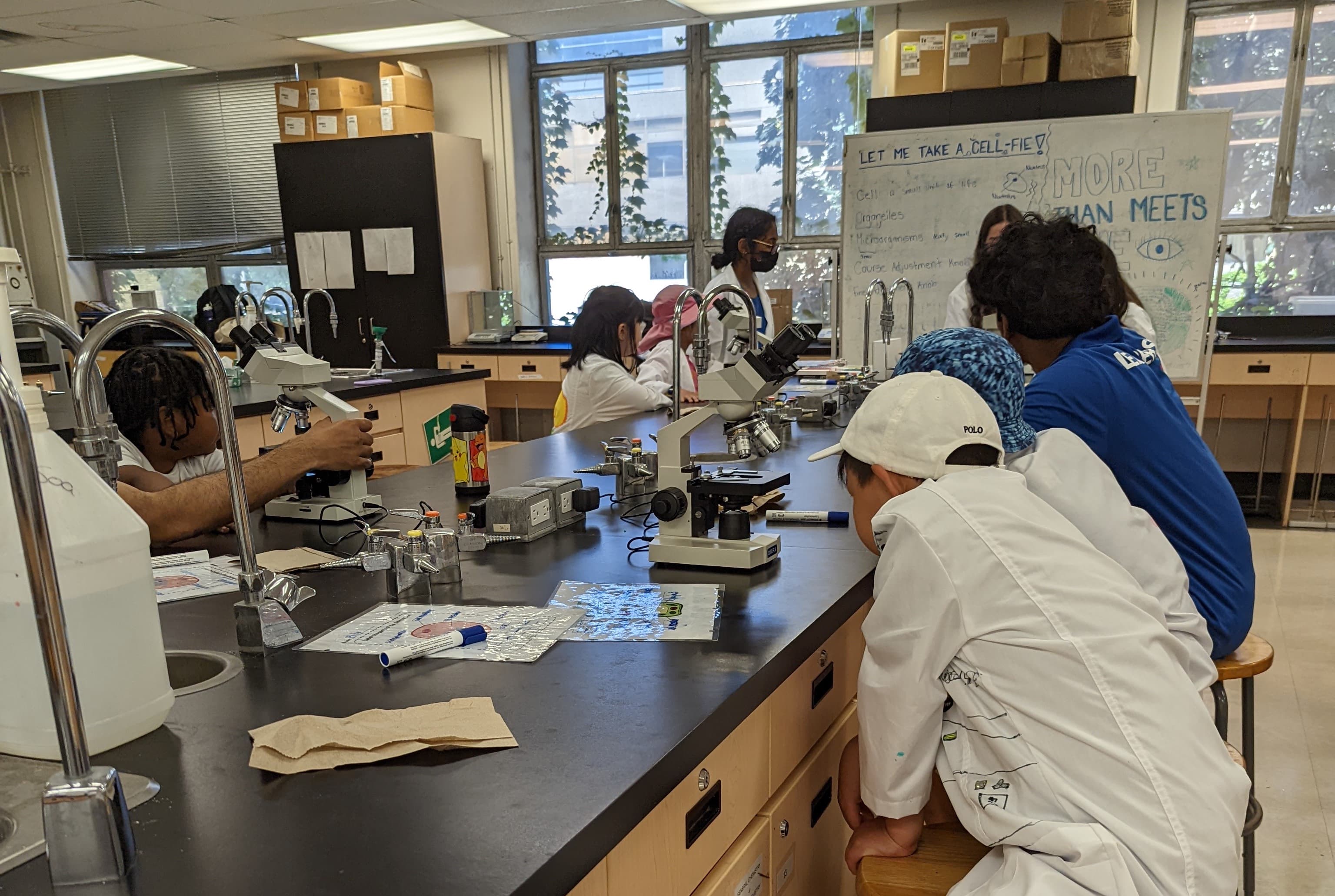 Our camp counsellors Sofia Verduga and Lynn John-Koshy leading the "Let Me Take a CELL-fie" workshop with campers in the lab. This lesson gives students the opportunity to learn how to use a microscope and learn about cell structures and organelles.