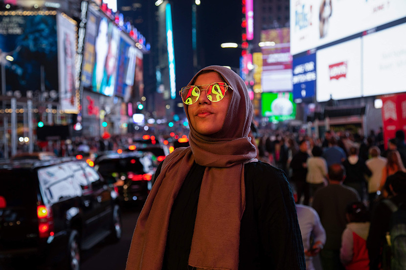 (Pictured: Afrah Idrees standing in Times Square at night during the SI4SJ program).