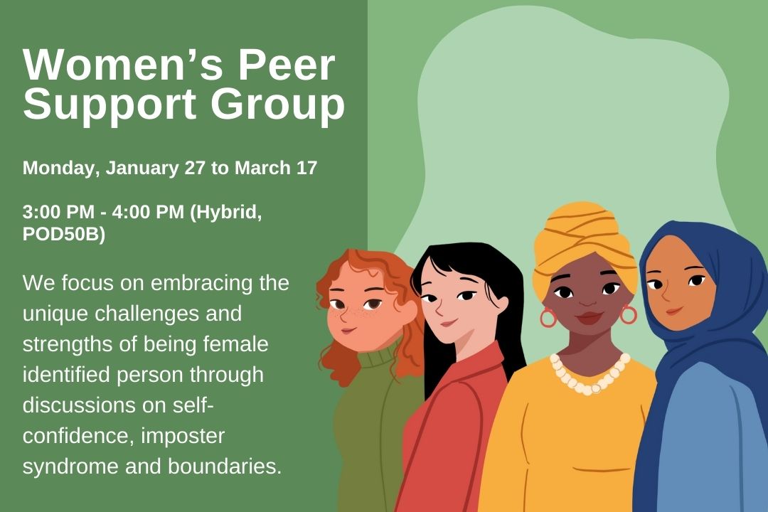 Our Women's Peer Support Group is a dedicated space where any female identifying student  can connect, grow, and empower one another. Through heartfelt discussions and transformative sessions on building self-confidence, navigating imposter syndrome, cultivating healthy relationships, and setting boundaries, we focus on embracing the unique challenges and strengths of being a woman. With workshops and relaxing activities like movie nights and yoga retreats, we create a safe haven for women to nurture themselves, celebrate their journeys, and find the strength to thrive in all aspects of life.