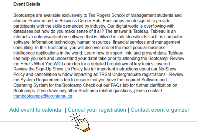 You will be cancelled from any upcoming free TRSM events you may have registered for. Any paid or Program Advising and Student Success (academic-focused) events are not included in this cancellation as we want to ensure your academic success.