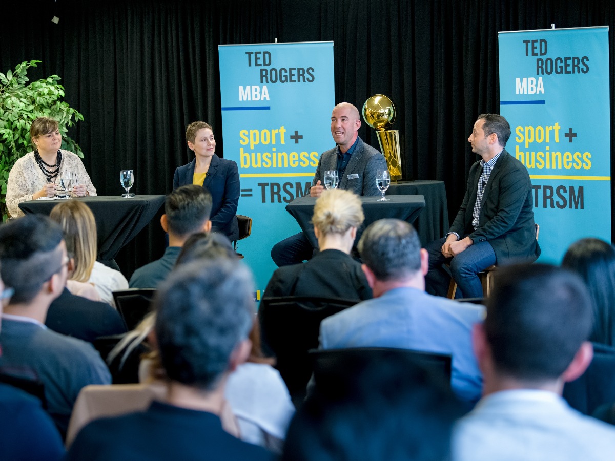 The event featured a panel of senior sport business executives (two of whom are Ryerson graduates) – Leah MacNab, Managing Director of NBA Canada (Postgraduate Marketing Certificate from Ryerson), Daniel Freiman, Digital Media Manager of NBA (Ted Rogers MBA, 2013) and Michael Bartlett, Vice President of Community Affairs at MLSE.