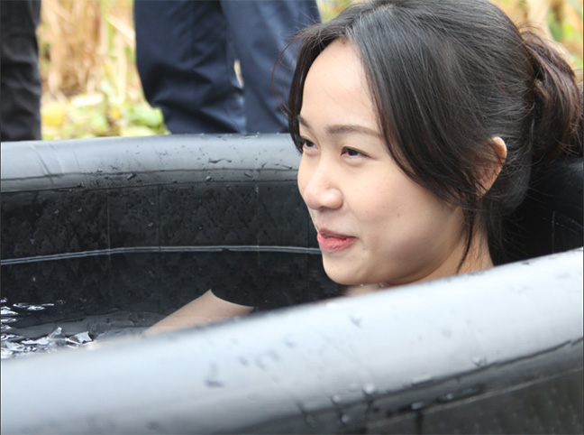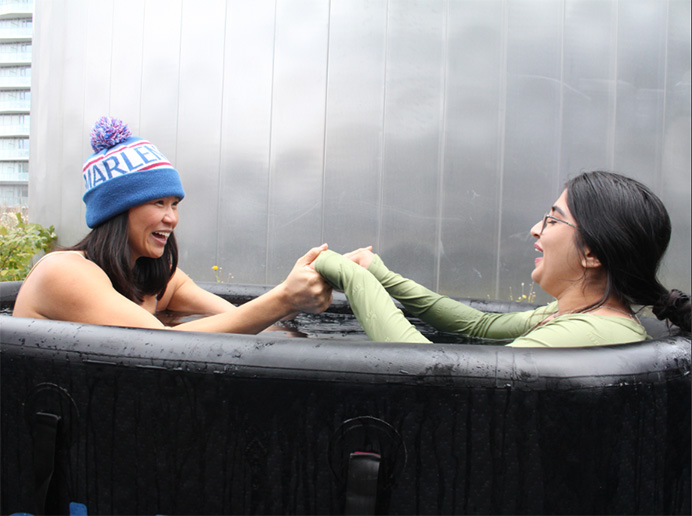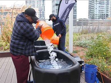 The polar plunge, which was part of Dr. Ellen Choi’s MHR741 - Interpersonal Effectiveness and Teams course, took place on the rooftop of TMU’s Urban Farm at the Daphne Cockwell Health Sciences Complex on October 16-17. Students submerged themselves in bathtubs full of ice and cold water for up to two minutes in a safe environment.