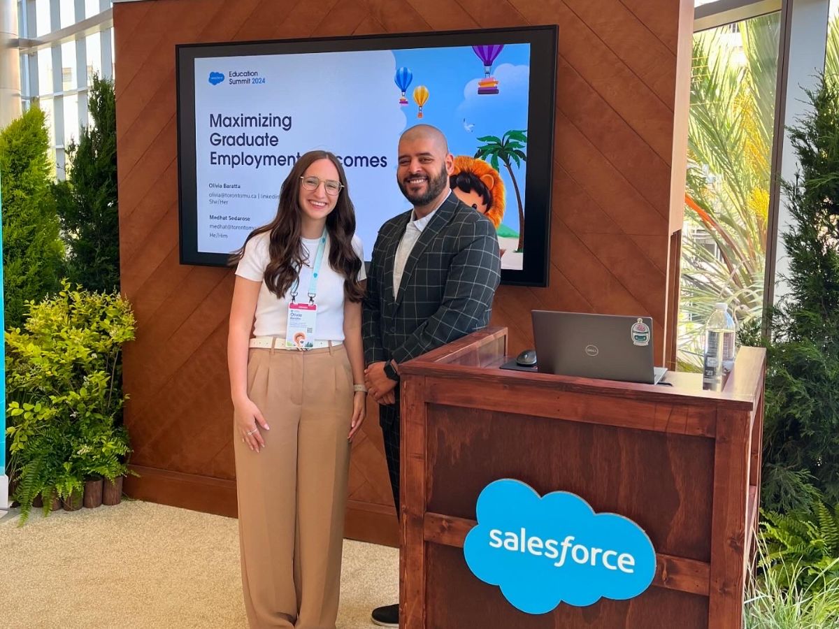 Olivia Baratta and Medhat Sedarose from the Ted Rogers School’s Business Career Hub had the unique opportunity to present at this year’s Salesforce Education Summit (external link, opens in new window) , representing one of just two Canadian schools selected.