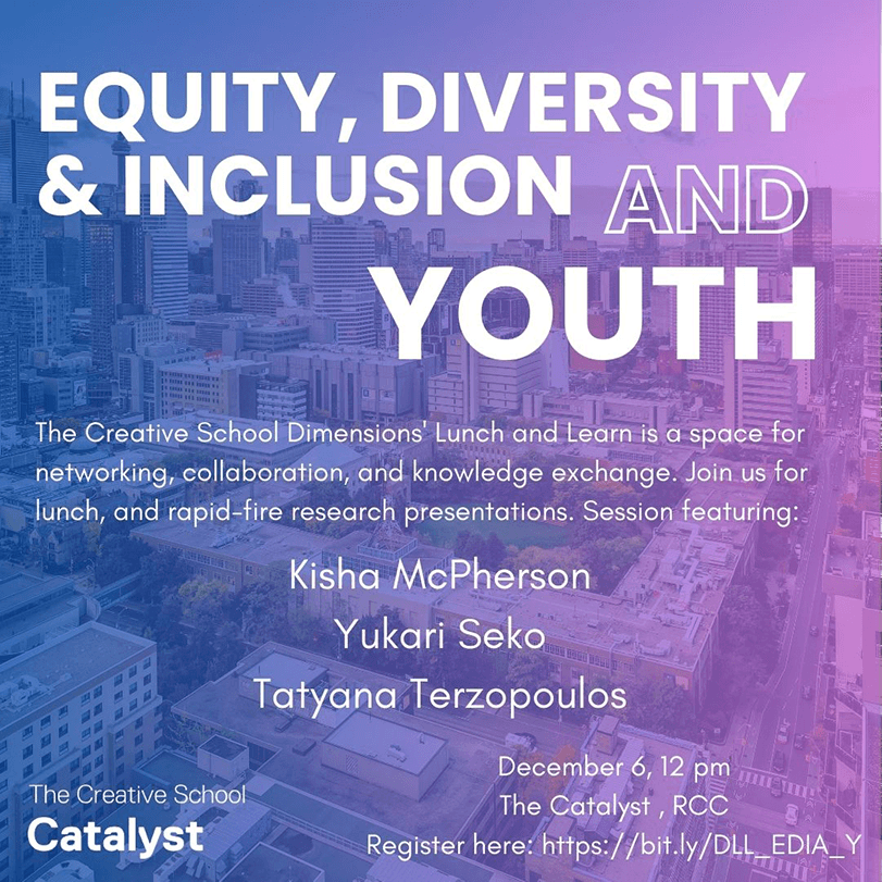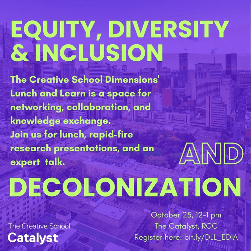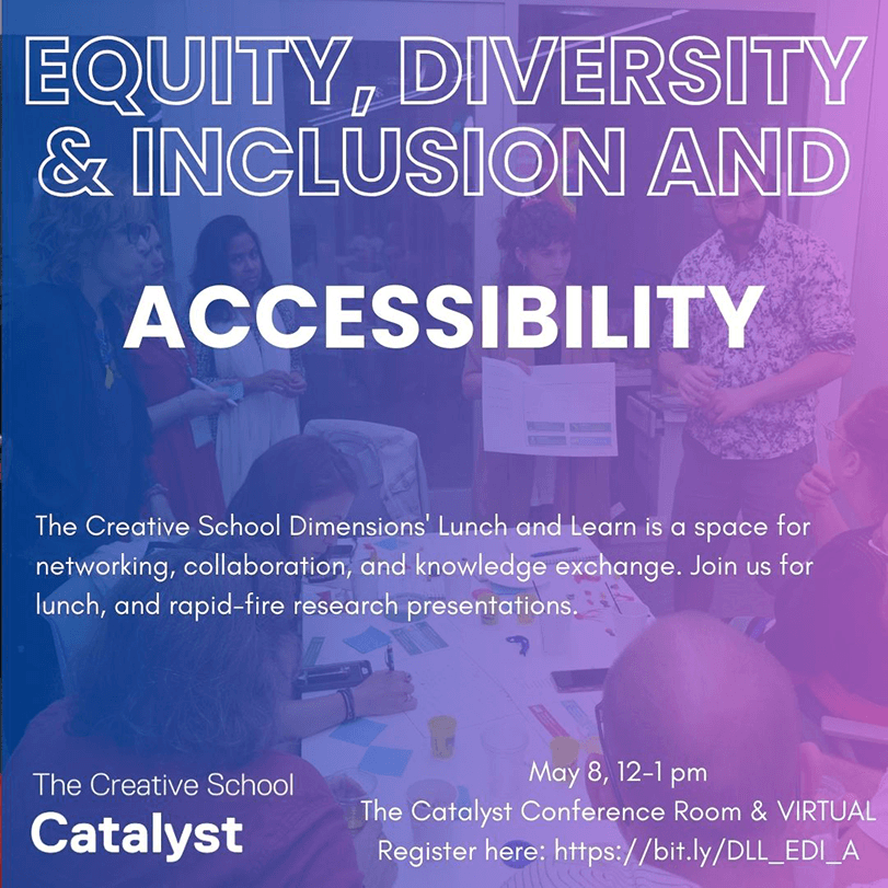The Dimensions Lunch and Learn intends to bring researchers from across The Creative School to share their research with each other in The Creative School Catalyst. This is a space for conversation and lunch! Researchers at any stage (undergraduate, graduate and faculty) are welcomed to join.