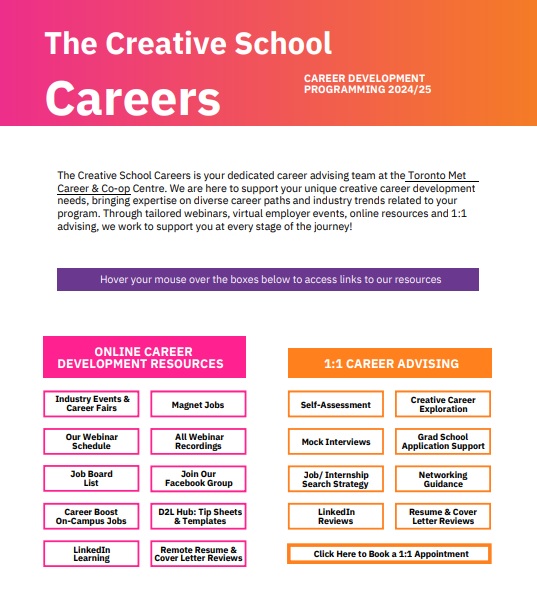 The Creative School Careers is your dedicated career advising team at the Toronto Met Career & Co-op Centre. We are here to support your unique creative career development needs, bringing expertise on diverse career paths and industry trends related to your program. Through tailored webinars, virtual employer events, online resources and 1:1 advising, we work to support you at every stage of the journey!
