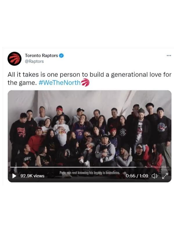 The clip played on the Jumbotron at the Toronto Raptors game against the Detroit Pistons on November 13th at the Scotiabank Arena, and is featured on the league’s social media (external link, opens in new window) . The video was premised on the idea that all it takes is one person to build a generational love of the game, and features various members of the Taino family from Toronto showing support for their favourite team - highlighting the impressively diverse fanbase of our city’s basketball team.
