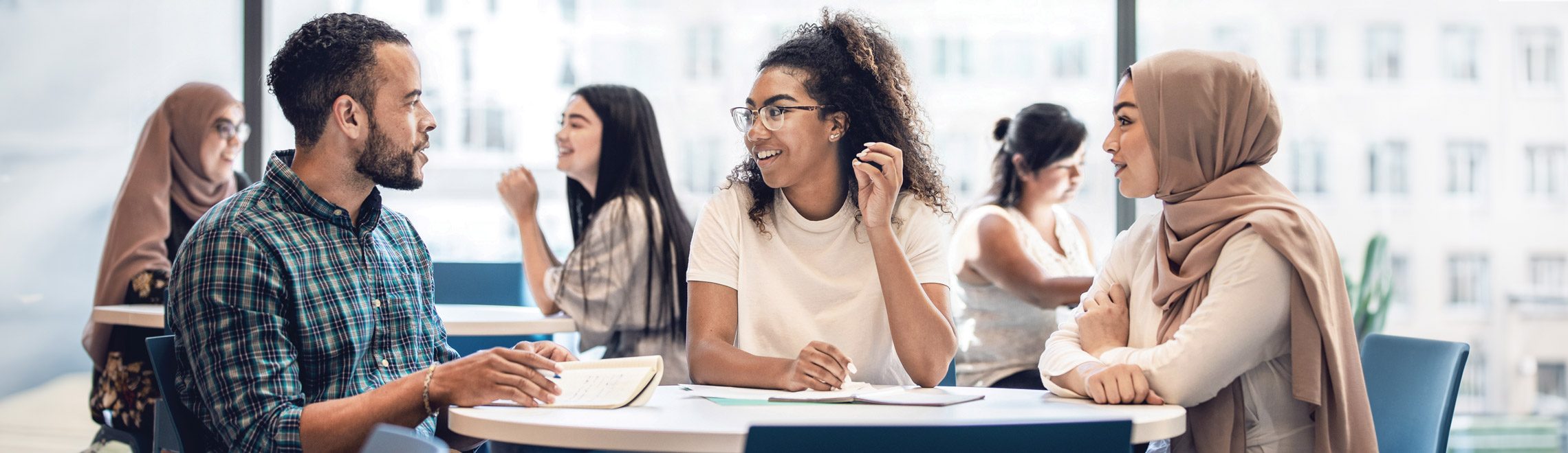 Three students laugh and talk while sitting around a table together in a student space on campus.