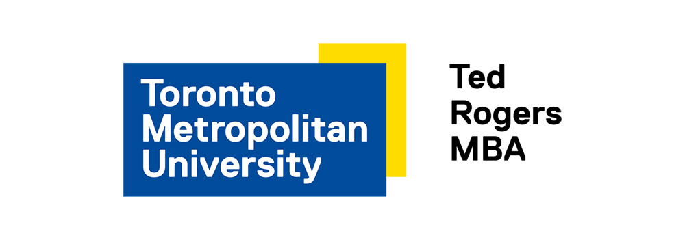 Please don't alter this logo lockup. The Ted Rogers MBA text is always black, unless the lock-up appears on a dark background, in which case text is set in white. Spacing and alignment is set by the university's lockup guidelines.