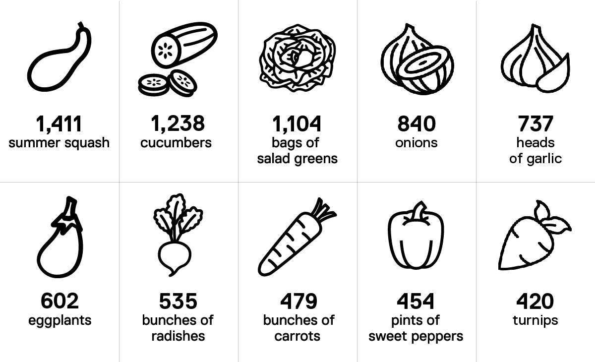 1,923 cucumbers. 1,212 eggplants. 999 bags of salad mix. 585 bunches of swiss chard. 485 summer squash. 478 bunches of carrots. 457 pints of sweet peppers. 456 pints of cherry tomatoes. 342 heirloom tomatoes. 327 bunches of radishes.