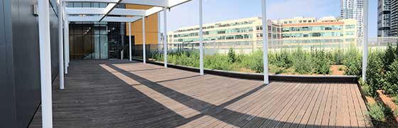 A secondary entrance to the rooftop primarily used for deliveries or when transporting produce is also available. The secondary entrance can be accessed by taking the freight elevator to the fifth floor mechanical room, where a few steps lead out onto the rooftop. The mechanical room has a 32” wide exterior doorway. A temporary ramp measuring 37” wide with a 1:12 slope can be set up upon request.