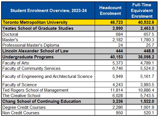 The table below provides an overview of student enrolment at Toronto Metropolitan University for the 2024-25 academic year. It is organized by credential type and faculty.