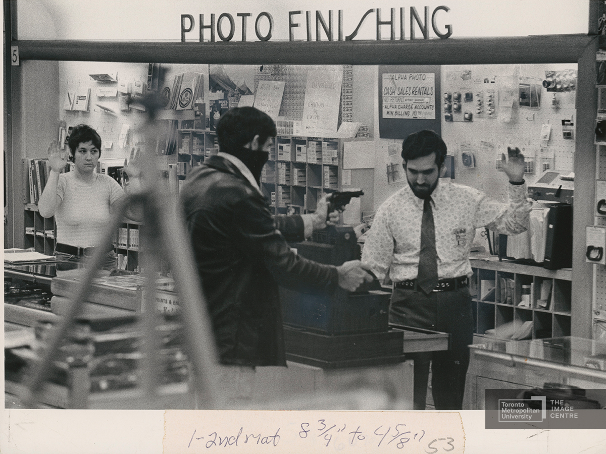 Civil rights and social justice movements were uniquely documented through photography. Instead of only recording these events in print-form, documentary photography rose in popularity by professional and self-employed photographers and photojournalists. Unlike most of Fitch’s other photographs, which focus on civil rights, this photo is of an armed robbery. From the 1960s to the 1970s, Oakland had a large increase in violent crime, especially robbery. Fitch likely frequented various photoshops throughout the city to purchase new equipment and develop film. One of those visits may have been to this store.