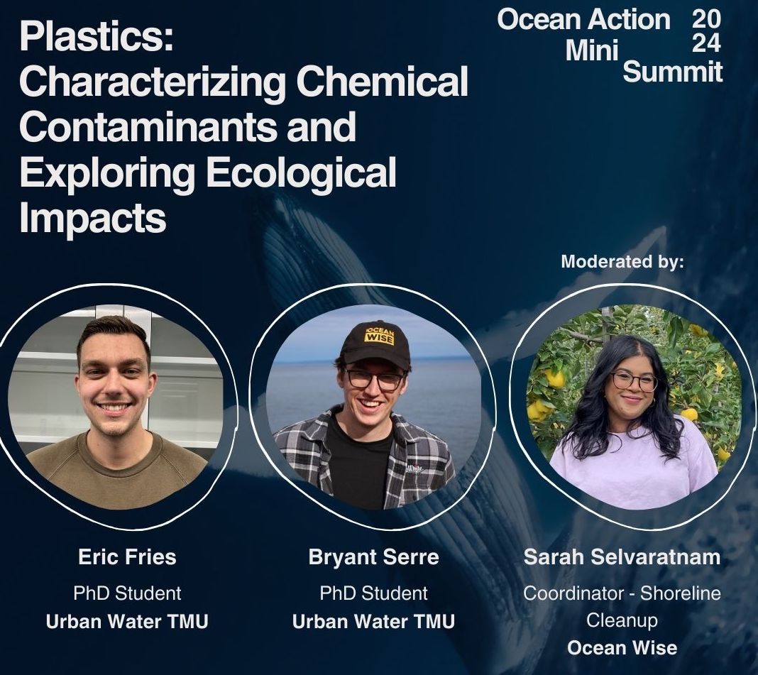 Urban Water TMU PhD students Eric Fries and Bryant Micheal Serre were invited speakers at the Ocean Action Mini Summit 2024. Both students presented their research and the work of Urban Water TMU and participated in a panel discussion during the "Plastics: Characterizing Chemical Contaminants and Exploring Ecological Impacts" session. Summit was well attended by a diverse audience interested in learning more about plastic pollution and impacts on our waterways.