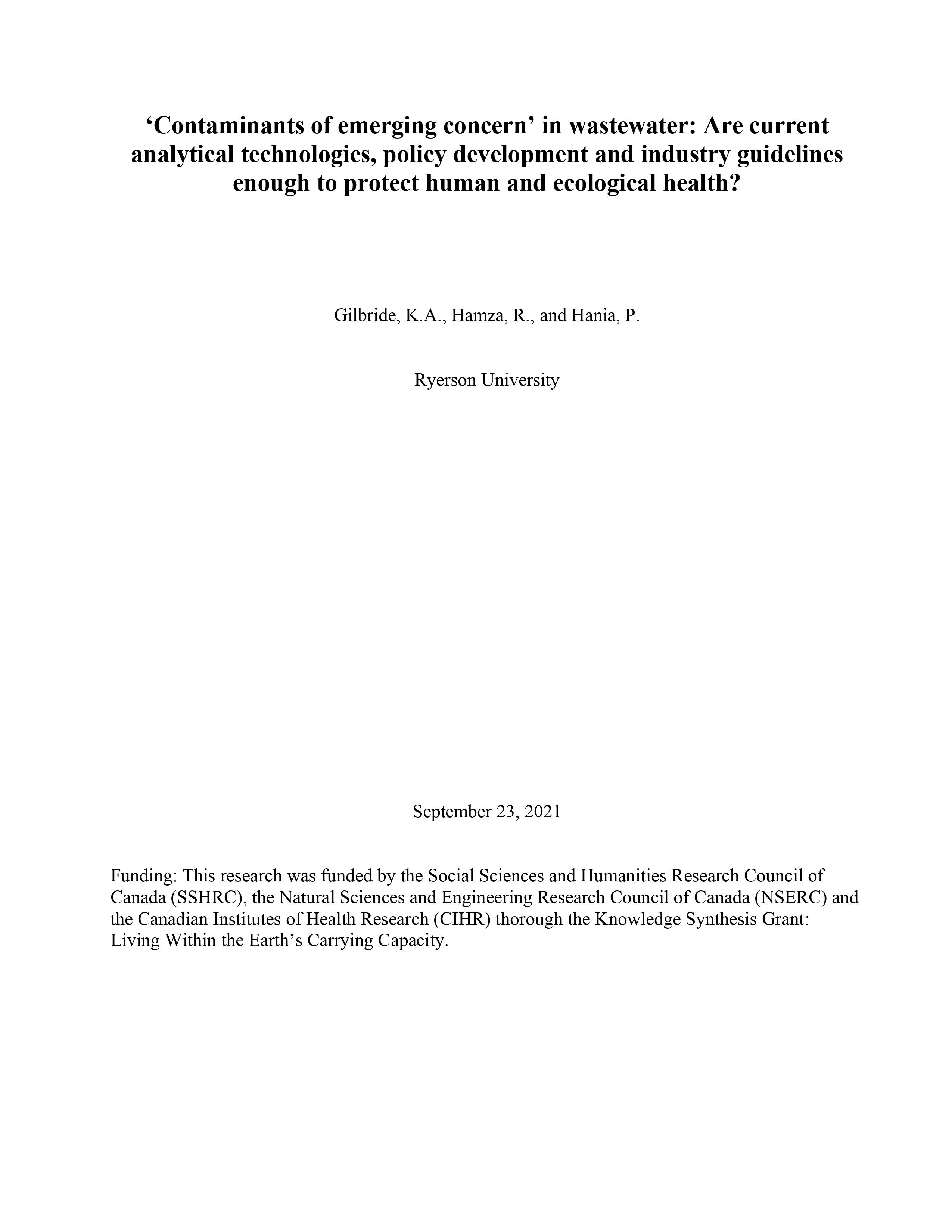 Contaminants of emerging concern (CECs) are broadly defined as compounds that are not currently monitored or regulated. Research has shown that CECs discharged from wastewater treatment plants (WWTPs) are present in downstream freshwater sources, which are relied upon for drinking water and fish habitat. However, the lack of a CEC regulatory framework for WWTPs combined with the narrow characterization of CECs as discrete chemicals (without consideration for synergistic impacts) has resulted in a knowledge and governance gap that leaves freshwater, ecosystem and human health unprotected.