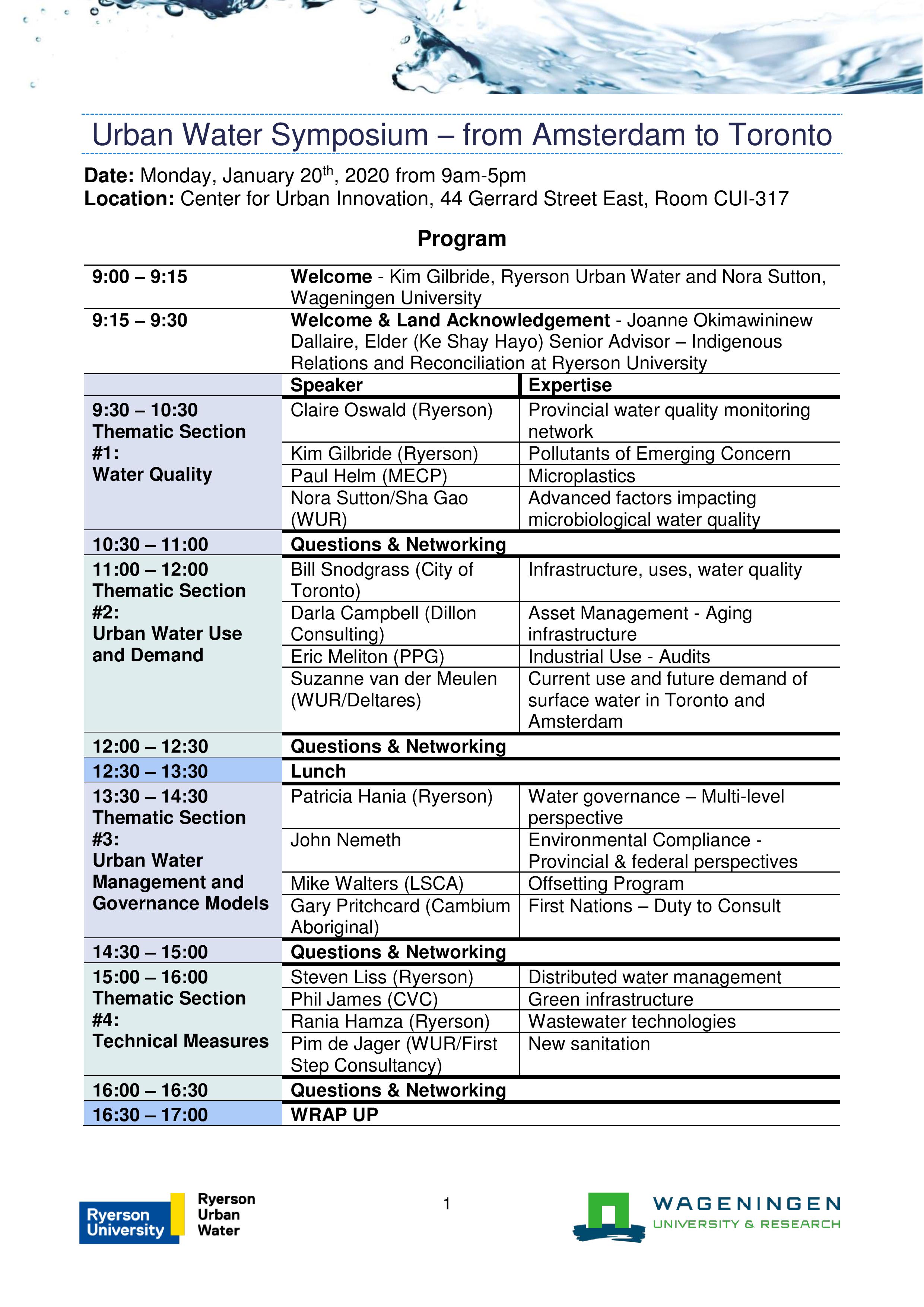 The Urban Water Symposium - From Amsterdam to Toronto was a one day event, held on January 20th, 2020, that was held in collaboration with Wageningen University from The Netherlands. It was aimed to share research and future developments in the areas of water quality, use and demand, management and governance, and technical measures from Amsterdam to Toronto. This symposium was the genesis of the FUNky water research project between Urban Water TMU and Wagengen University.