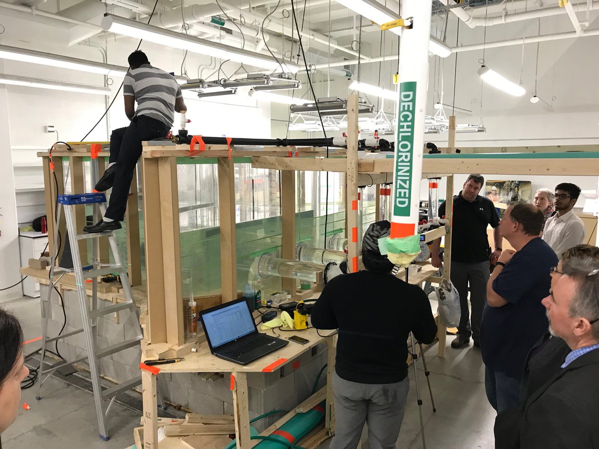 Through a partnership with WSP Consulting, Urban Water TMU researchers are testing a physical model of the North Shore WasteWater Treatment Plant Wet Well currently under construction in Vancouver, BC. The Urban Water TMU research team includes James Li, Darko Joksimovic, and 3 Masters students.