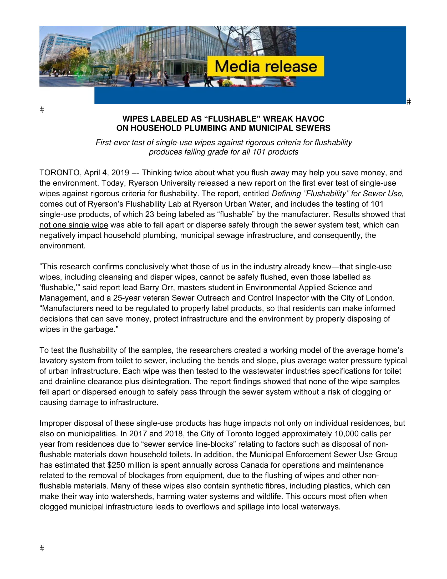 Thinking twice about what you flush away may help you save money, and the environment. Toronto Metropolitan University released a new report on the first ever test of single-use wipes against rigorous criteria for flushability. The report, entitled Defining ”Flushability” for Sewer Use, comes out of Ryerson’s Flushability Lab at Urban Water TMU, and includes the testing of 101 single-use products, of which 23 being labeled as “flushable” by the manufacturer. Results showed that not one single wipe was able to fall apart or disperse safely through the sewer system test, which can negatively impact household plumbing, municipal sewage infrastructure, and consequently, the environment.