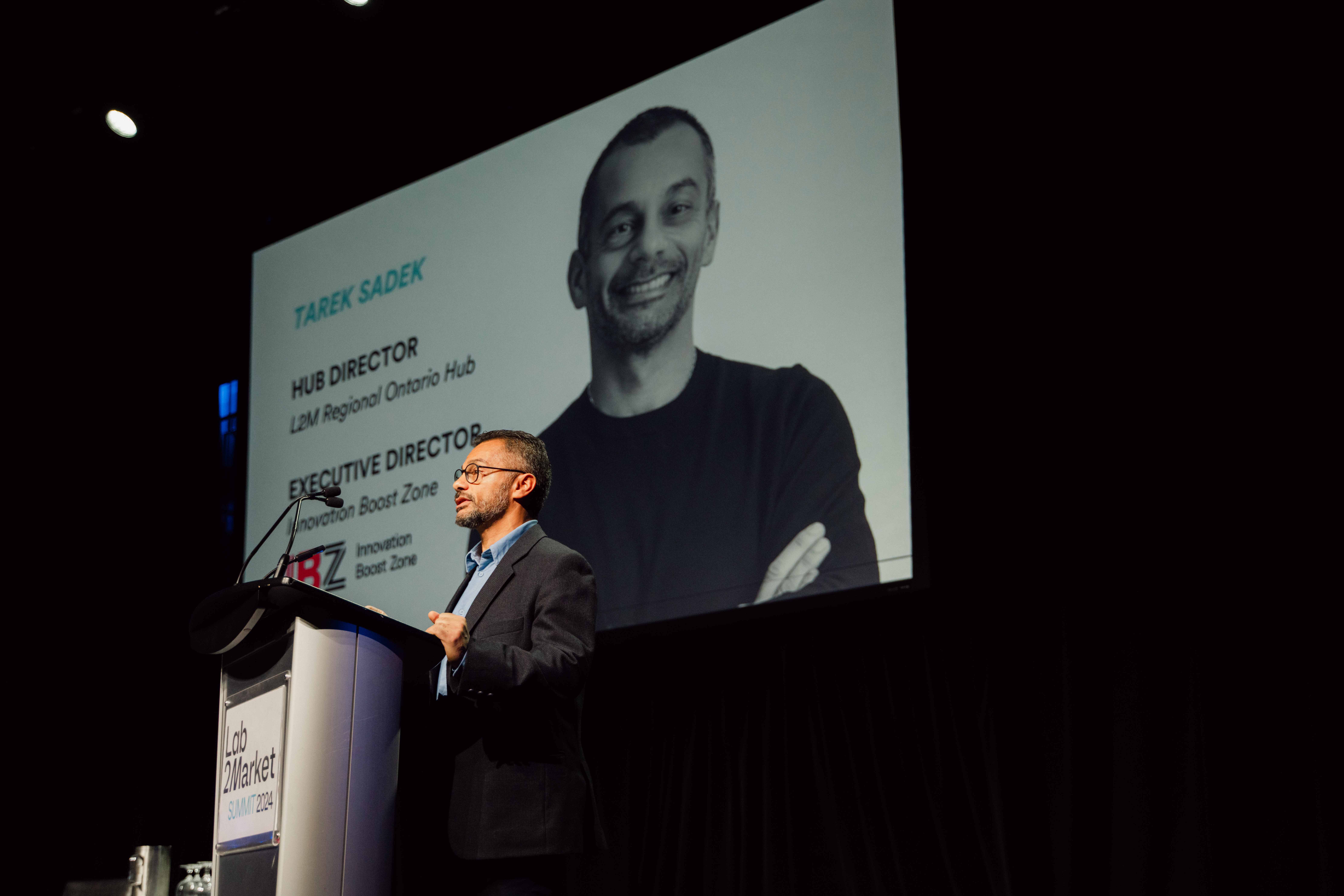 Tarek Sadek, Executive Director of the Innovation Boost Zone and Lab2Market Ontario Hub Lead, speaking at the Lab2Market Summit. Photo Credits: Daybreak Studios
