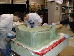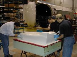 The 2003 chassis was designed using Solid Edge. The completed design was then analyzed and a male mould was CNC machined from a solid piece of high-density foam at Webber Manufacturing. The male plugs were then used to create female fibreglass moulds. Both the plugs and the fibreglass female moulds were then taken to Multimatic, where the composite monocoque was created.