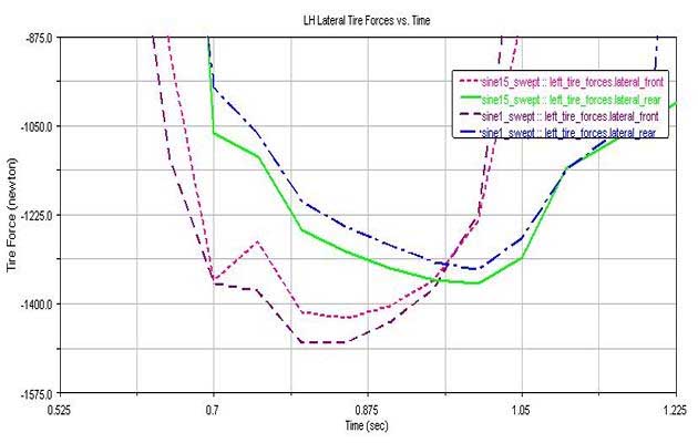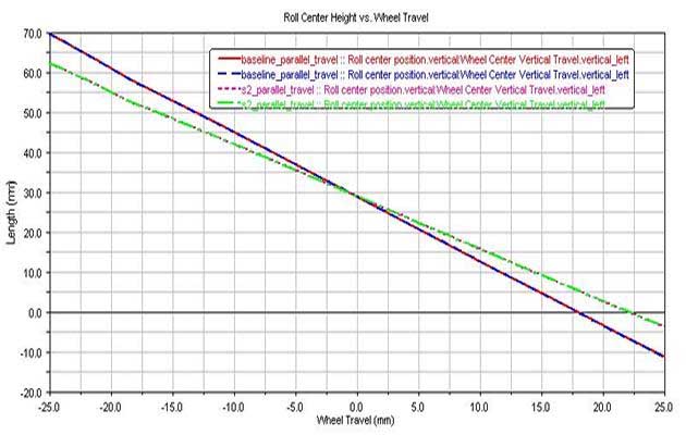 Simulation is the next step in engineering development. Our team strongly recommends performing ADAMS analysis on any FSAE vehicles before hitting the track, and if possible, integrate the analysis into the design process (this is where the capabilities of ADAMS are most advantageous). The analysis helped change tire forces to a more even left-right weight distribution during cornering which will help maximize cornering speeds and reduce tire wear. Simple analysis was done on static parameters such as roll center (results are shown below).