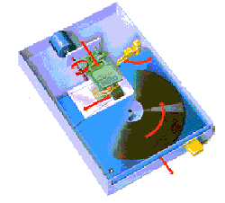 Hard Drives Hard Drive ComponentsLike a motherboard and random access memory (RAM), a failed hard drive can render a computer useless. But unlike a mother board and RAM a hard drive is a mechanical devicewith moving parts, making it susceptible to damage. A hard drive has five main components: Head accuator, circuit board, spindle, read/ write heads, and platters. Head actuator - Controls the read/write heads. Circuit board (logic board) - Receives commands from the hard drive controlelr and translates them in order to move the head actuator, which moves the read/write head across the platters. Spindle - Spins the platters and is run by a motor. Read/Write Heads - Move across the platters to write data to and read from the platters. Platters - The aluminum alloy disks upon which data is stored in a hard drive. Platters, also called disks, are the part of the hard drive where data is stored. They are rigid magnetic disks made of an aluminum alloy covered with a thin layer of iron oxide. When a computer is on, these platters constantly spin on a spindle, which is driven by a motor. Each side of every platter has a read/write head, which writes data to and reads data from each platter. They are attached to the head actuator, which precisely moves the read-write heads across the platters. An integrated circuit board, also called a logic board, allows the computer to move the read/ write heads across the platter surfaces. Hard drives operate much like a record player spinning a vinyl record. Just like a record player's arm that holds the needle, the hard drive has a movable arm that carries the read/write heads across the platter's magnetic surface. Instead of grooves etched into the record's vinyl surface, magnetic sectors formed by formatting the disk are placed in concentric patterns on the platter. Computers record and "play back" data on hard drives much like a record player. Data is translated into a series of bits. The hard drive receives these bits and uses the read/ write heads to magnetically store or write the bits on one of the platters. This process involves converting the data to positive and negative magnetic fields on the platter's surface. The computer keeps track of where these bits are stored on the various platters so when you want to retrieve them, it can direct the read/write heads to the precise locations on the platters where the data is stored. The heads recognize the data stored as magnetic fields and send it to the computer's monitor within a few millionths of a second. Although the storage area of a platter's surface is smooth and unbroken, formatting the hard drive (preparing it so it can store data) gives it textured features. The surface's magnetic coating is divided into a series of cylinders containing tracks; each track is divided into sectors. These hard drive divisions are like a map that lets a computer determine exactly where it stores data. A cylinder is a set of tracks on a platter that can be accessed without read/ write head movement. Formatting a hard drive lays down an exact pattern of tracks that are the same distance from the spindle around which the platters rotate. Each group of tracks forms the shape of a cylinder. A track is the part of the platter's surface that passes under one read/ write head while it is stationary. Tracks form concentric circles beginning with track 0 at the outer edge of the disk. How close together these tracks are placed on a platter determines the amount of data it can hold. Each track is divided into sectors, which are identified by the side of the disk on which they are located, their track number, and the sector number within the track. Computers use a file system to organize the files on a disk. Each operating system- Macintosh, DOS, Windows, Windows 95, OS/ 2, and Windows NT-can only work with one or two filing systems. This is one reason why data saved to a disk formatted for one system cannot be read by another system. The File Allocation Table (FAT) is the file system developed by Microsoft Corp. for DOS and Windows. The common file systems are FAT (used by DOS, Windows 3.1, and early versions of Win95), FAT32 (used by later versions of Win95 and IBM's OS/2) New Technology File System (NTFS, used only on Windows NT), and High Performance File System (HPFS, also used alternately by OS/2 and Windows NT). The FAT, FAT32, and NTFS file systems rely on clusters as an integral part of data storage. A cluster is the smallest allocation unit in these three file systems. The table is much like a road map that represents whether each cluster of a disk is free or allocated to a file.
